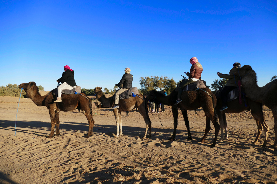 After breakfast, we shall leave for Ouarzazate. The first stop will be Atlas Studios, very famous for shooting many well-known films. Afterward, the Taourirt Kasbah will be a visit to an ancient, fortified mud castle. After that, we move on to Agdz, where we will get to the Draa Valley, the longest river in Morocco. We will be traveling alongside, stopping for stupendous views over the palm groves, extraordinary Kasbahs, and Berber communities. There will be time for lunch in Nkob or Alnif. After lunch hours, we continue towards the Sahara Desert of Merzouga through Rissani. Once we reach the Erg Chebbi dunes, we will be mounted on camels to traverse through the Sahara. We will stop at a big dune to admire the stunning sunset before heading towards our campsite, which mixes traditional nomadic tents with modern comforts. At the campsite, you’ll enjoy Berber drum music and dance around the campfire under the stars. Dinner will be served, and we will spend the night at the camp.