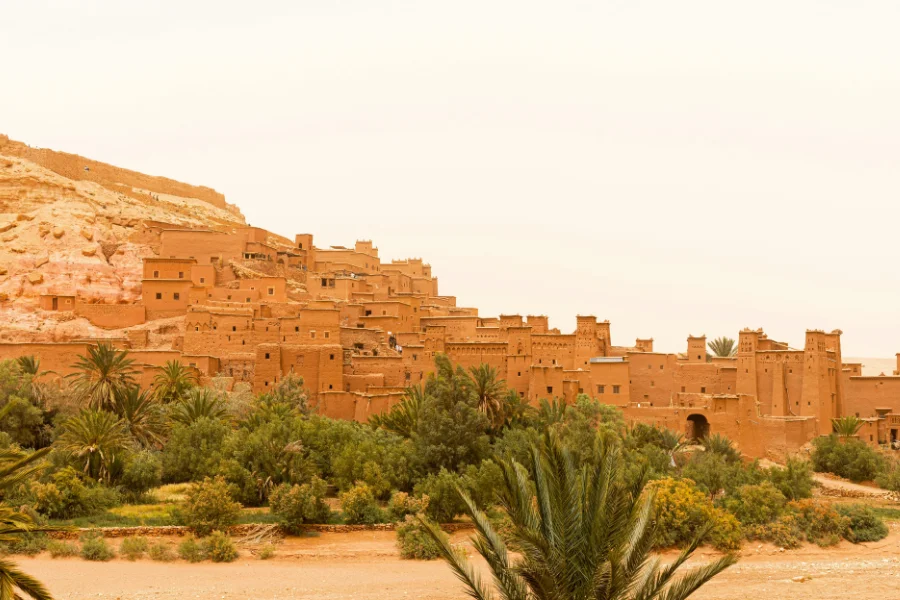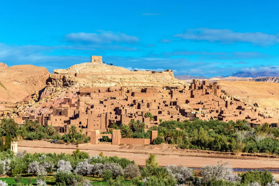After breakfast, we continue our way to Kalaa Magouna to see for ourselves the Rose Valley. In May, every year, a Rose Festival is celebrated, where residents sell their rose products. Next, we drive through Skoura palm trees. Then we arrive in Ouarzazate, also named the desert gate. Here we shall go and visit the Atlas Studios, where famous films were made.