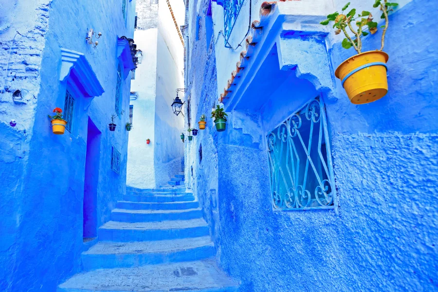 After breakfast, we drive along the ocean to Rabat, which is an important city in Morocco and is now the capital. You will visit the Hassan Tower, the Mausoleum of Mohammed V, and the Kasbah of Oudaya. Time for lunch. Next, we drive north through Ouazzane and up the Rif mountains to the blue city of Chefchaouen, known for its white and blue buildings and narrow streets. Overnight in a Riad.
